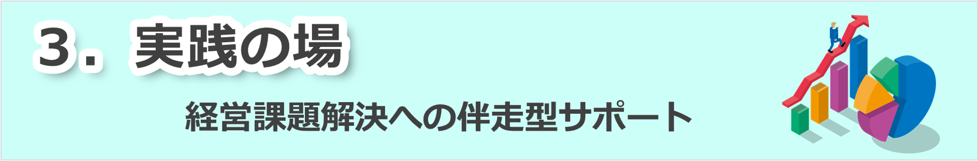 SNS等のオンラインツールや対面でのコミュニケーションを活用しながら、経営者の方々の自発的行動をサポートする3つの『場』を提供しております。
